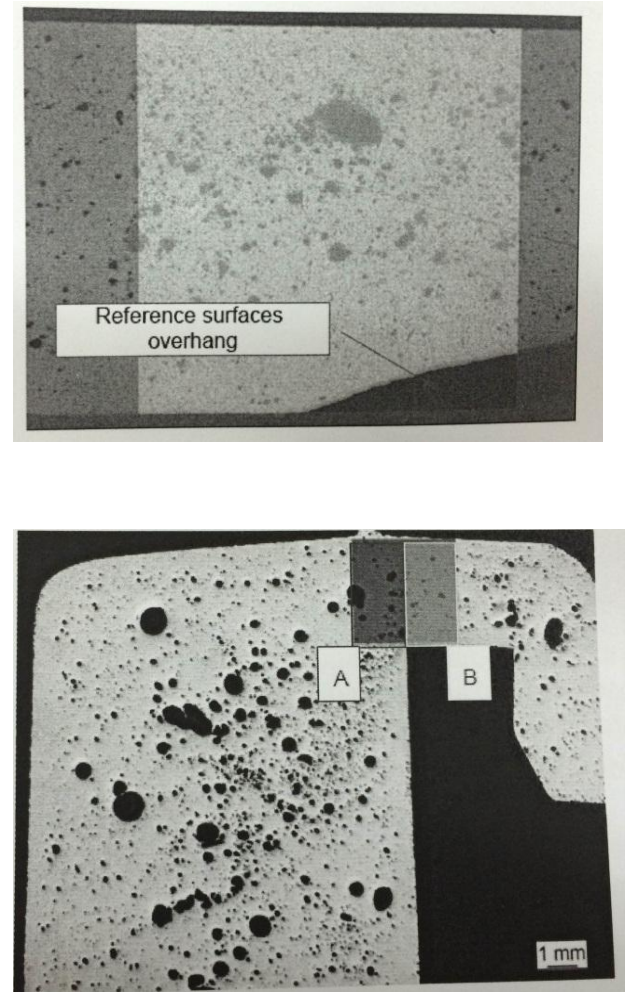 如果要求是小于5%,那么还必须在3X4mm的子评判区域里同时满足小于4%的要求(这和VW50097中D1-D4评判时的附加要求是一致的),但当图纸要求铸铁和铸钢的孔隙率是小于5%时,这个4%的附加要求可以在图纸里进行注明。1%-4%时修约到整数,大于5%时以5%为级数进行修约,0%不存在。