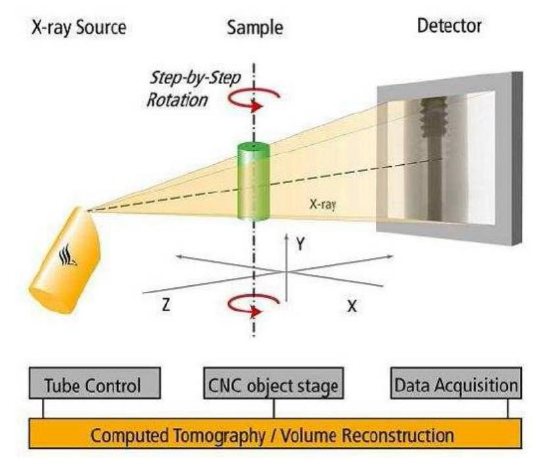 工业CT是在射线检测的基础上发展起来的,其基本原理是当经过准直且具能量的射线束穿过被检物时,根据各个透射方向上各体积元的衰减系数从不同,探测器接收到的透射能量也不同。按照一定的图像重建算法,即可获得被检工件截面一薄层无影像重叠的断层扫描图像,重复上述过又可获得一个新的断层图像,当测得足够多的二维断层图像就可重建出三维图像。